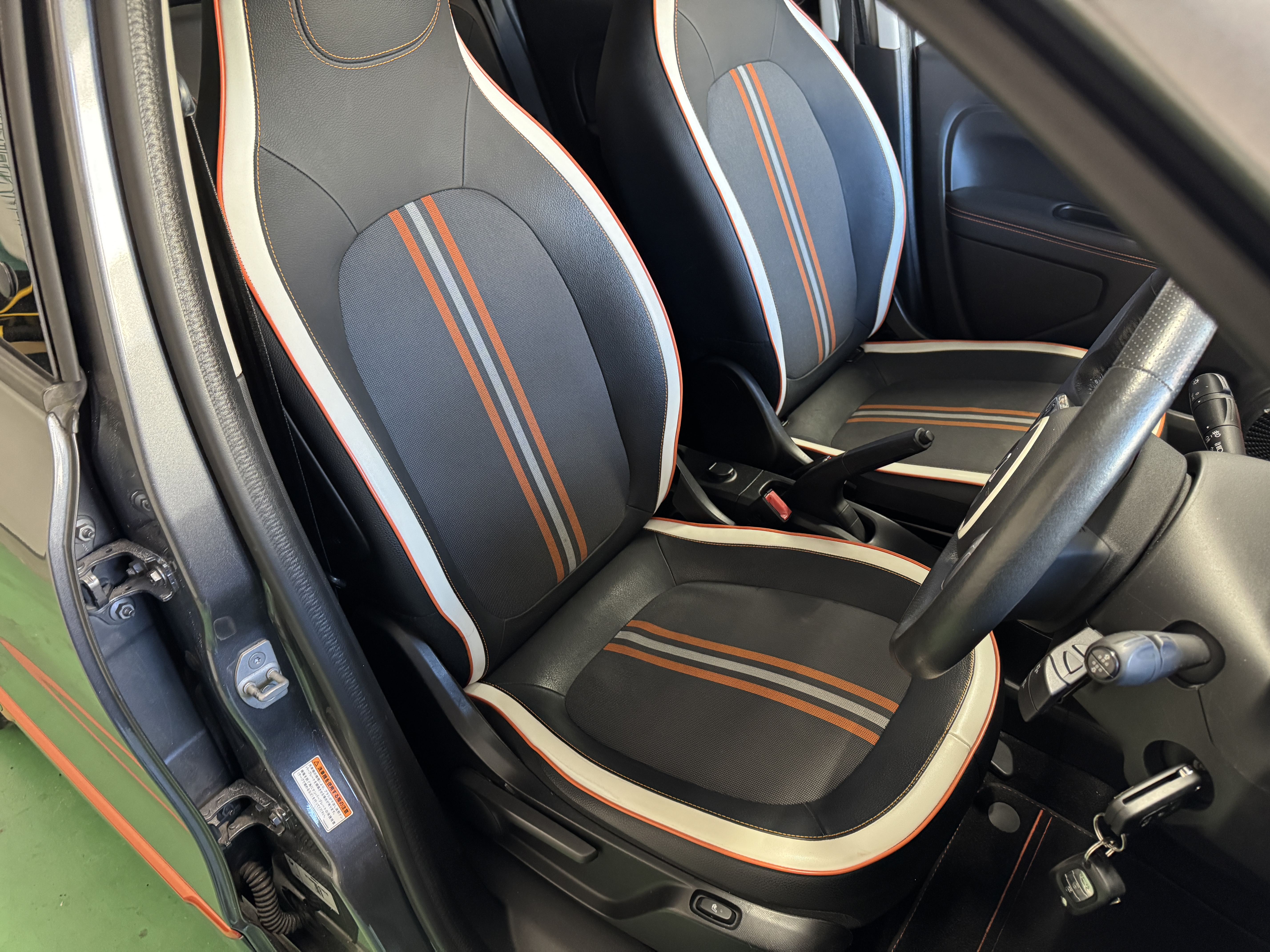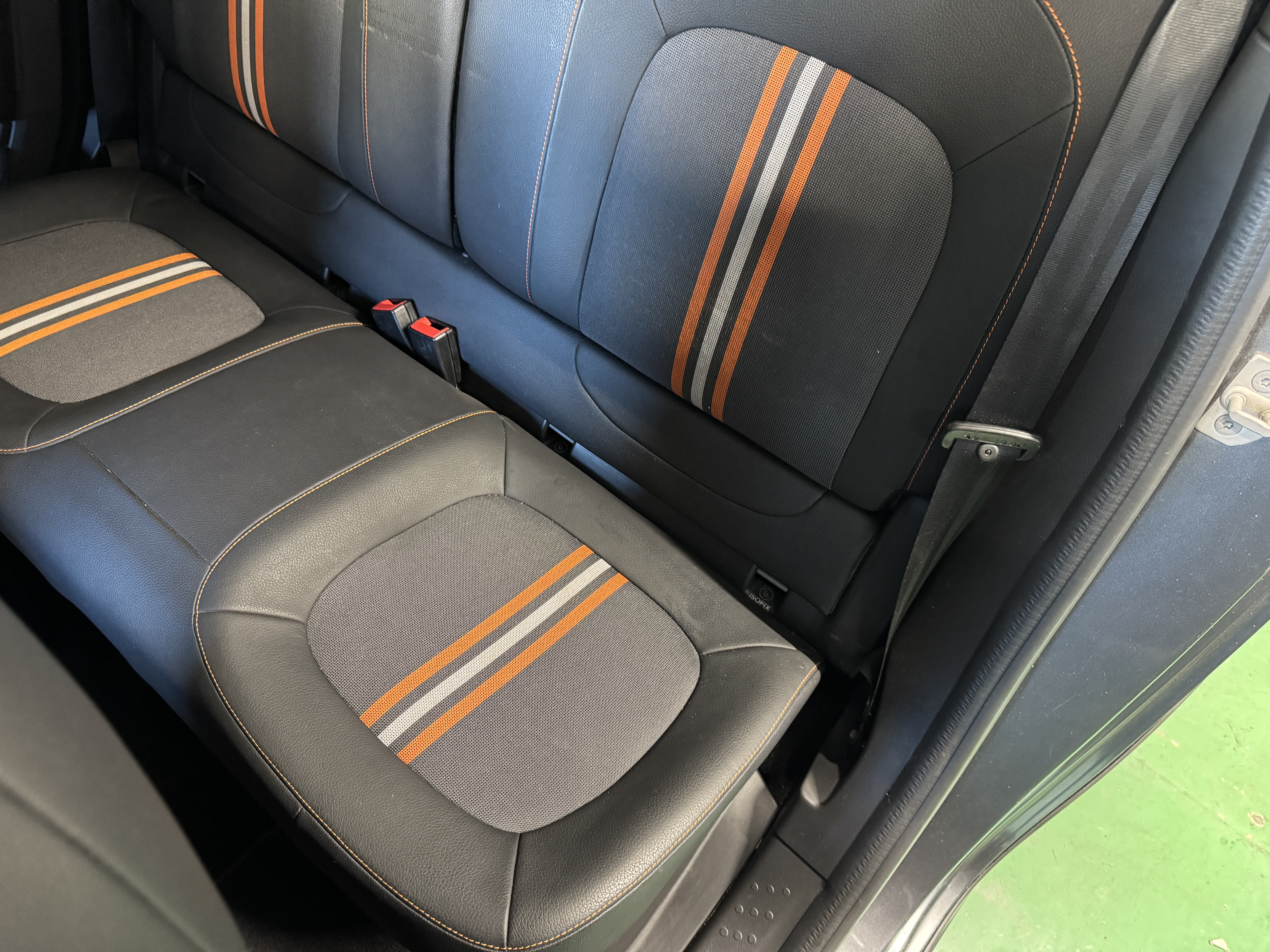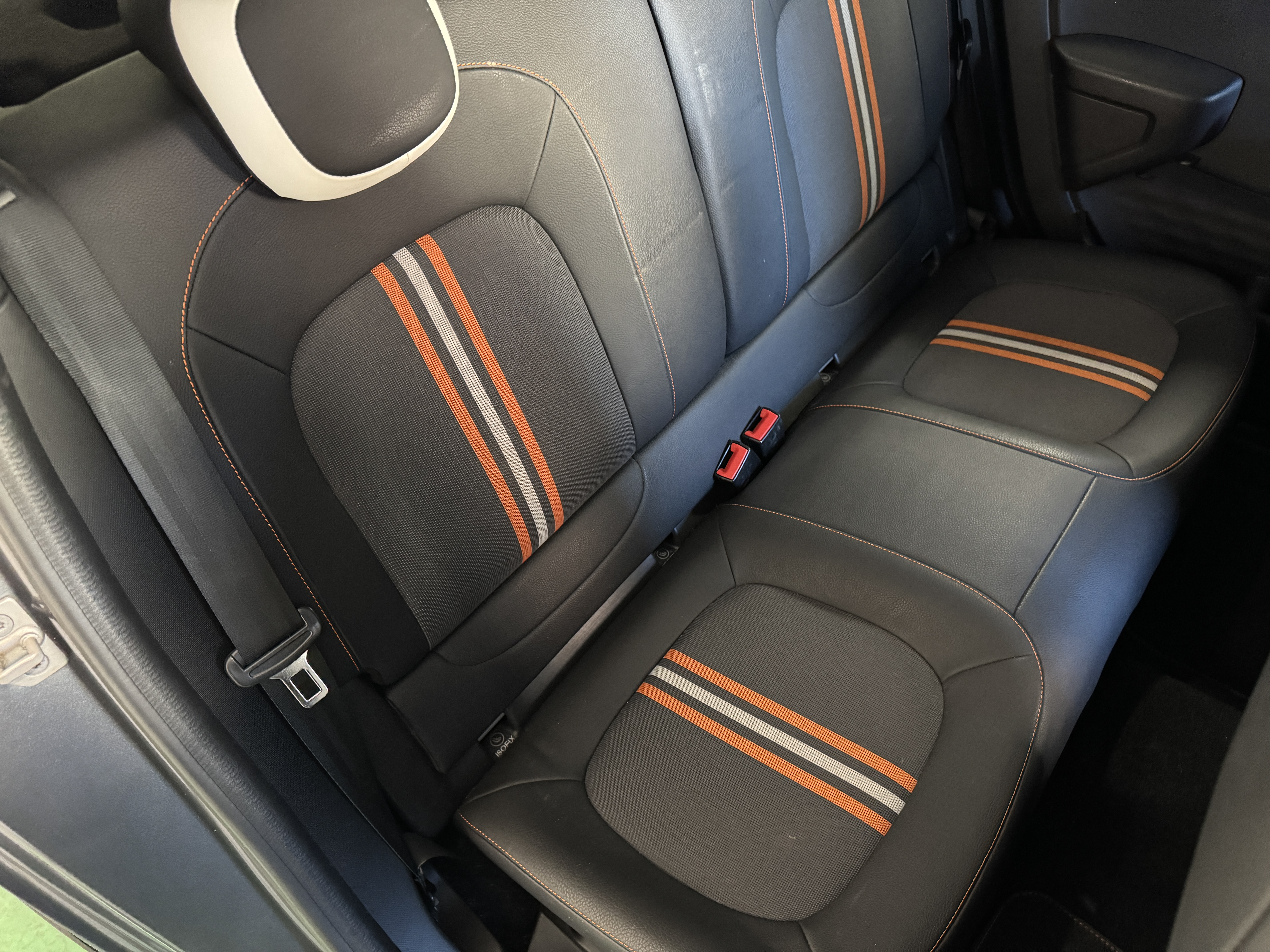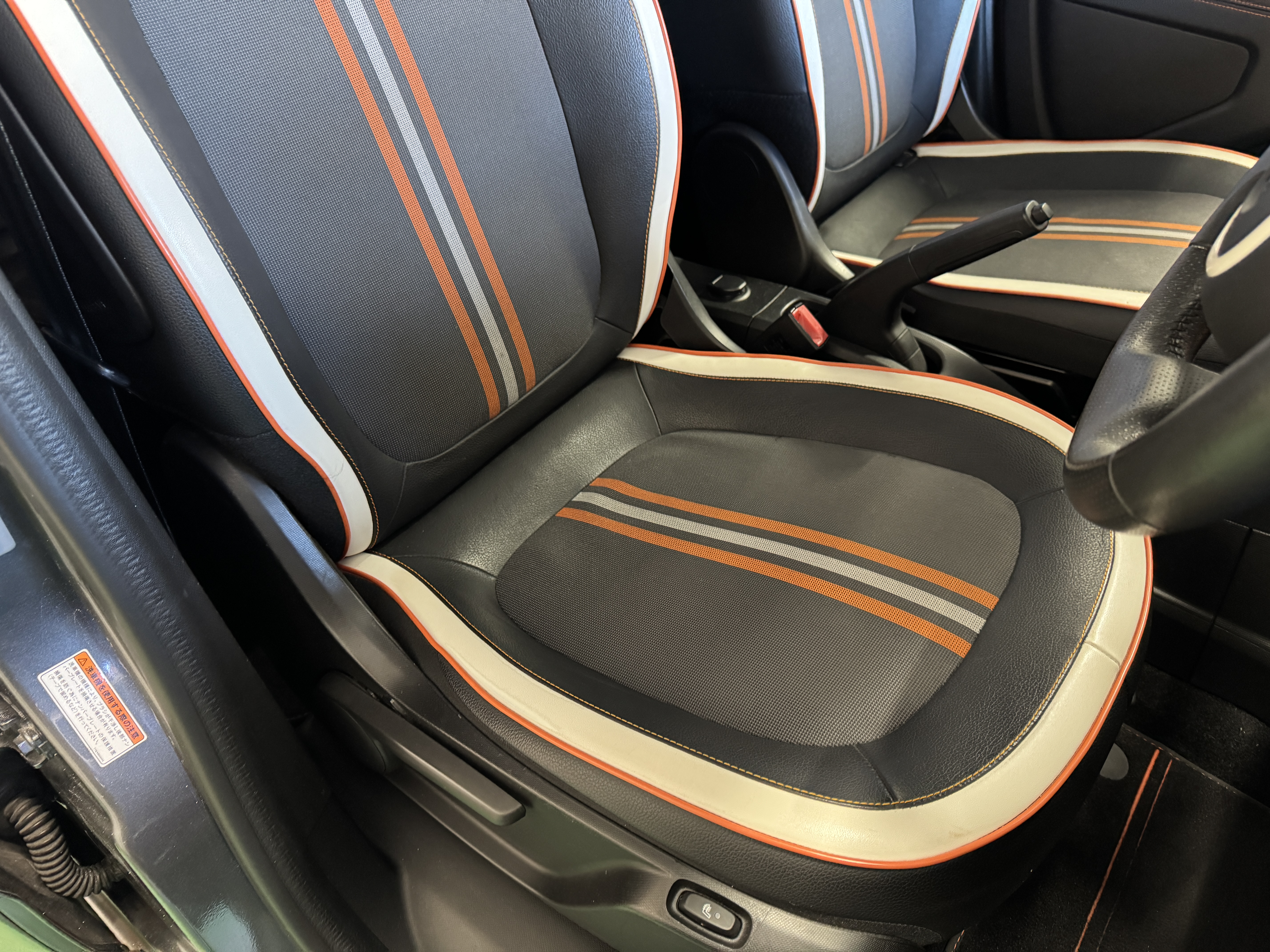 ファブリック×フェイクレザーのシート生地を採用し、オレンジステッチとなっております。