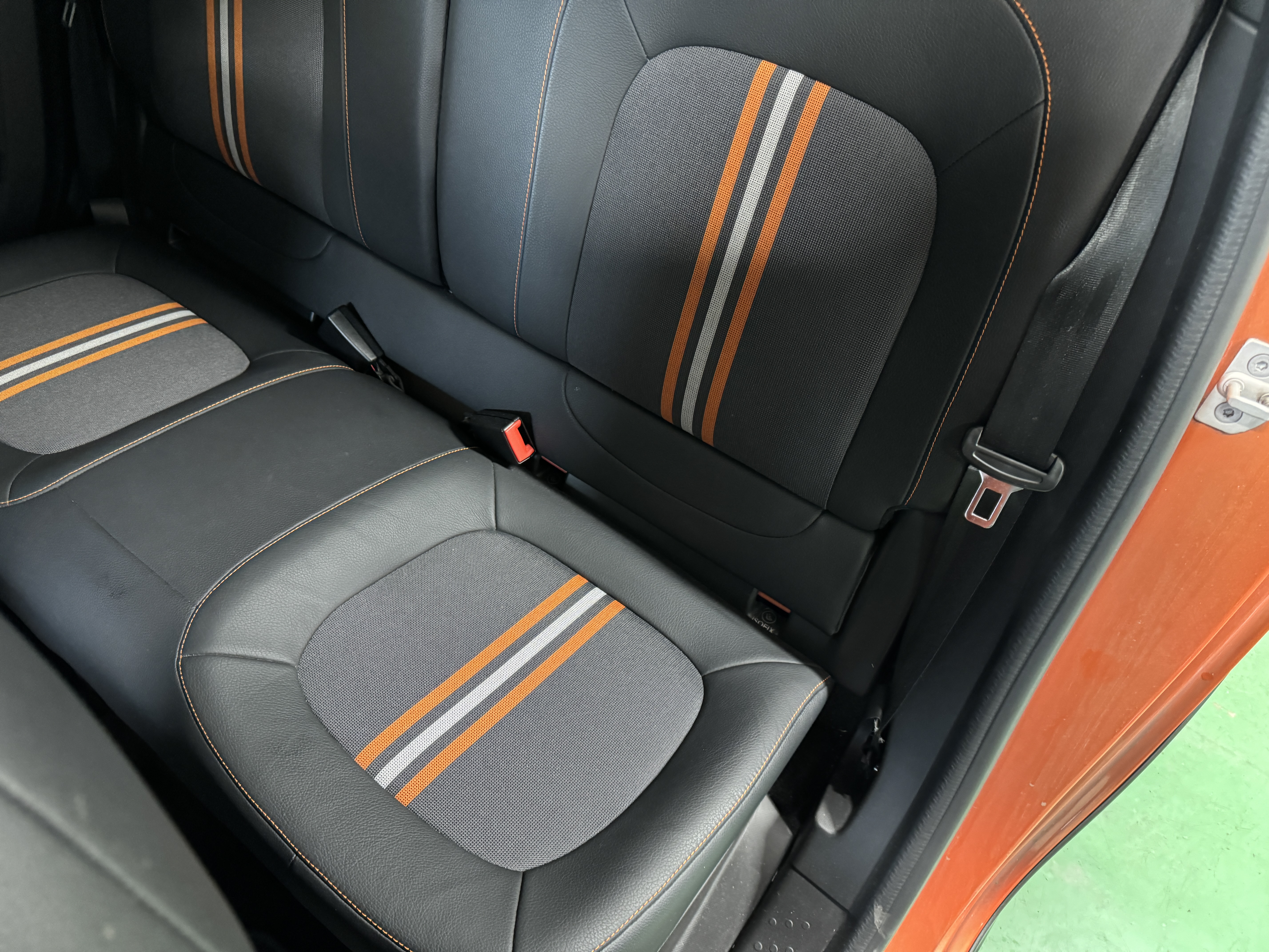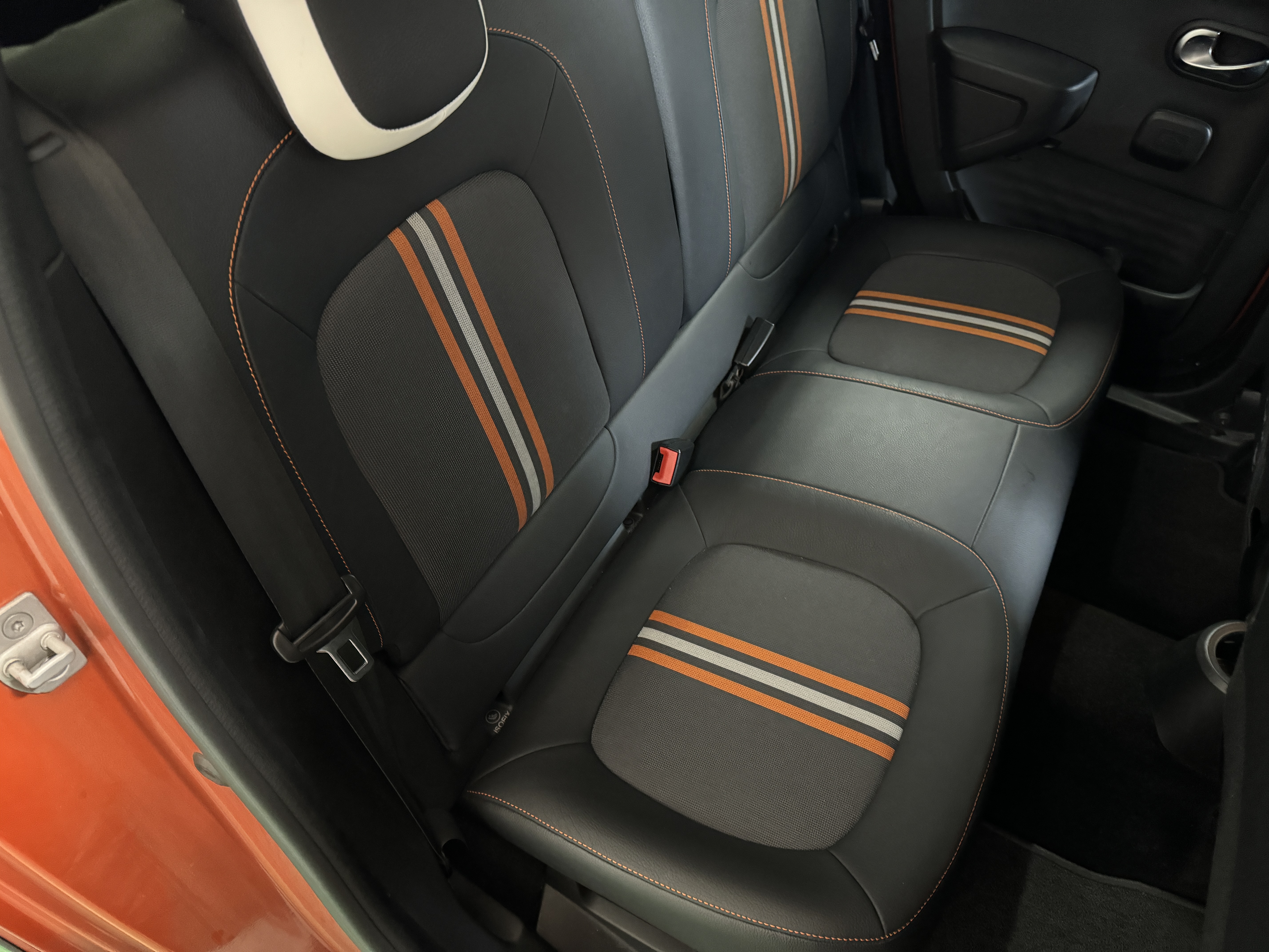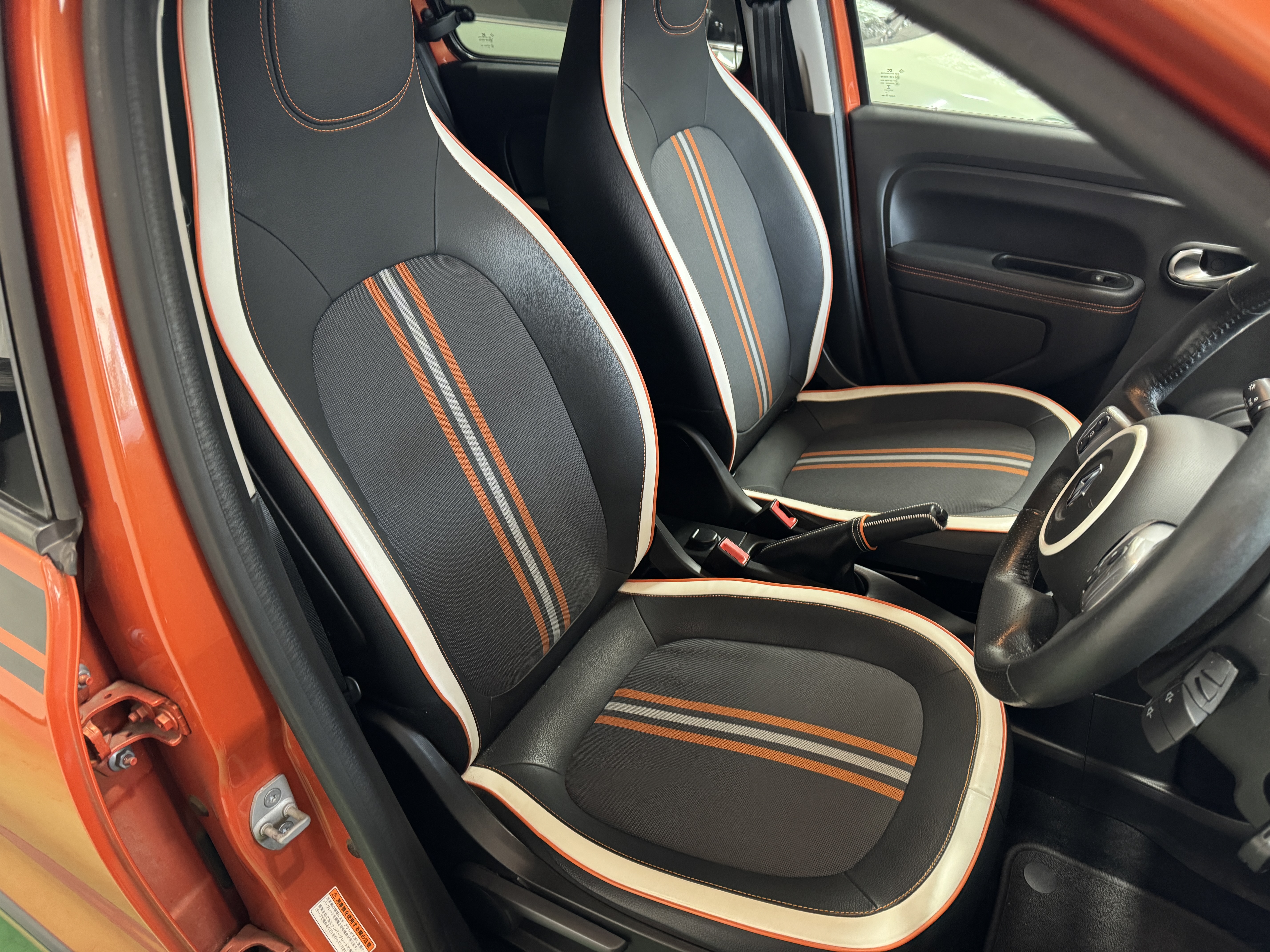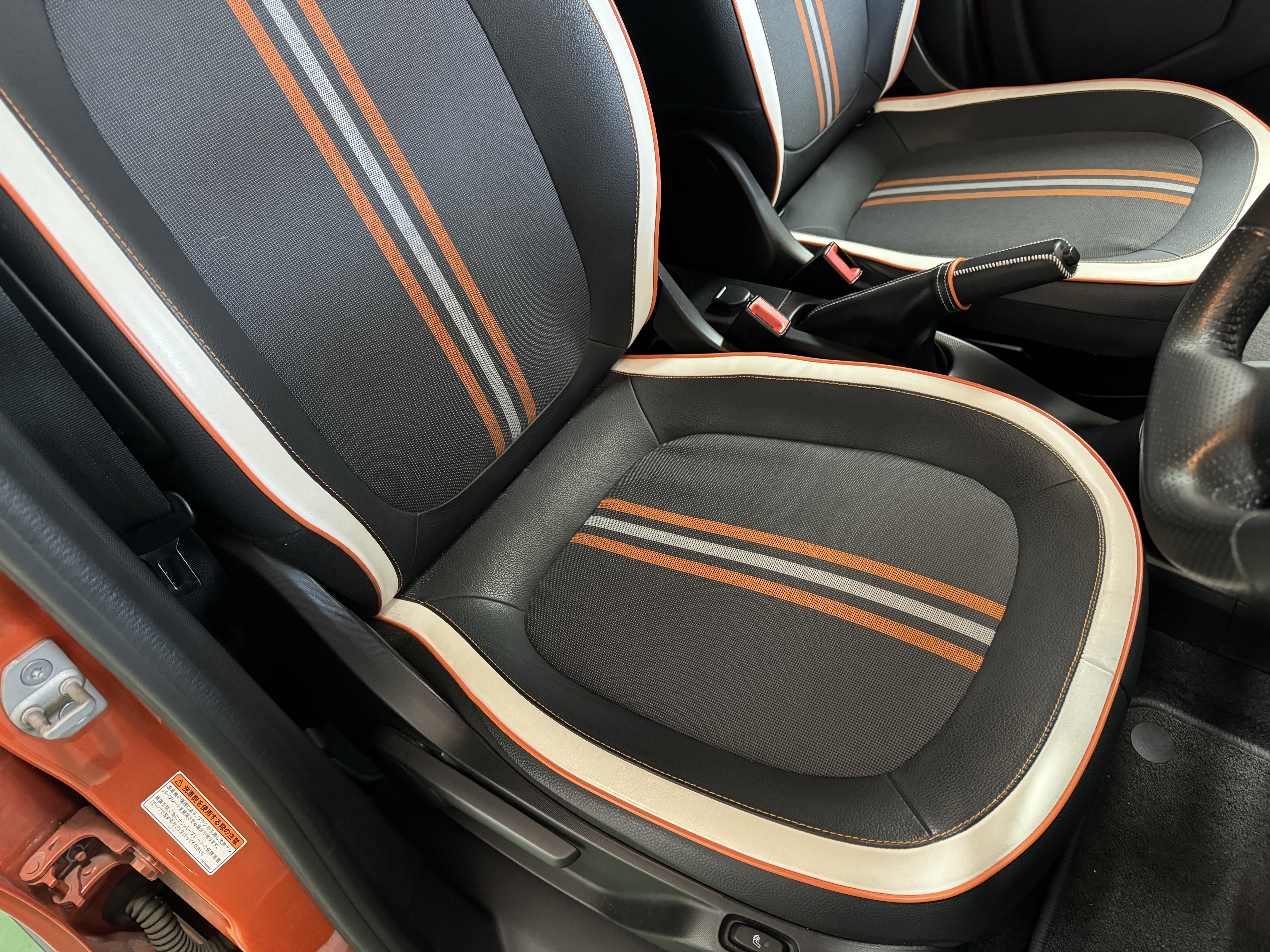 ファブリック×フェイクレザーのシート生地を採用し、オレンジステッチとなっております。