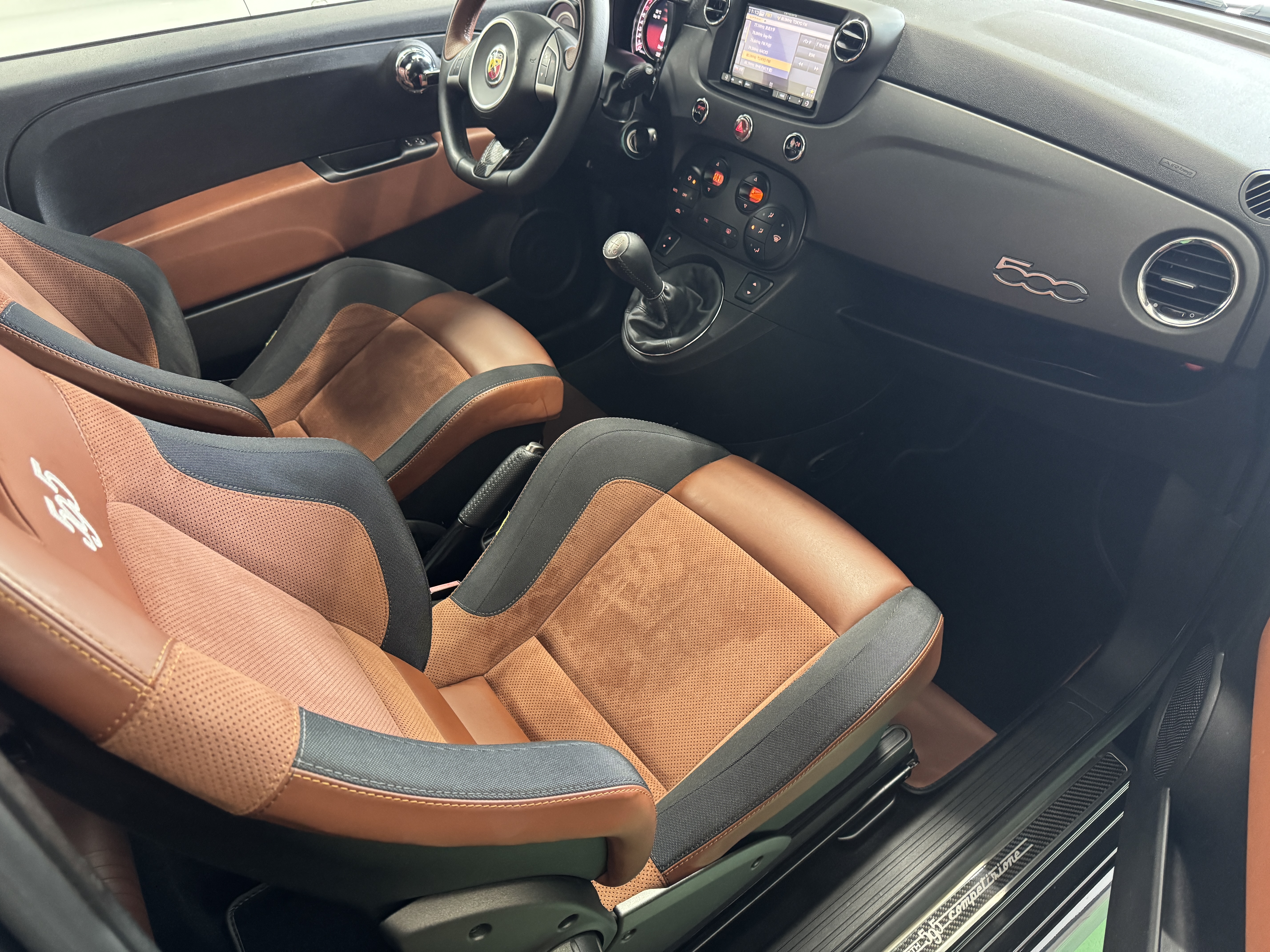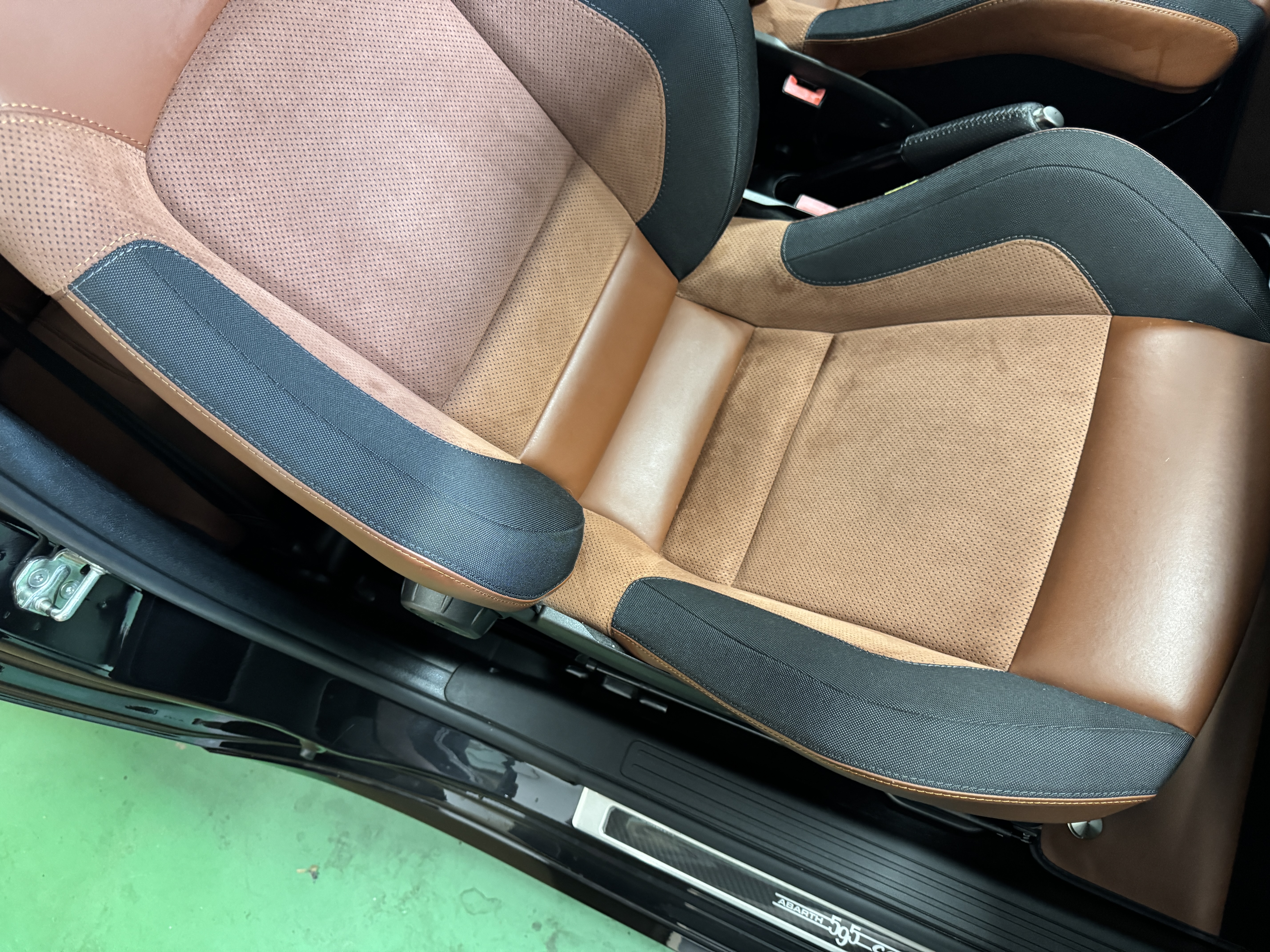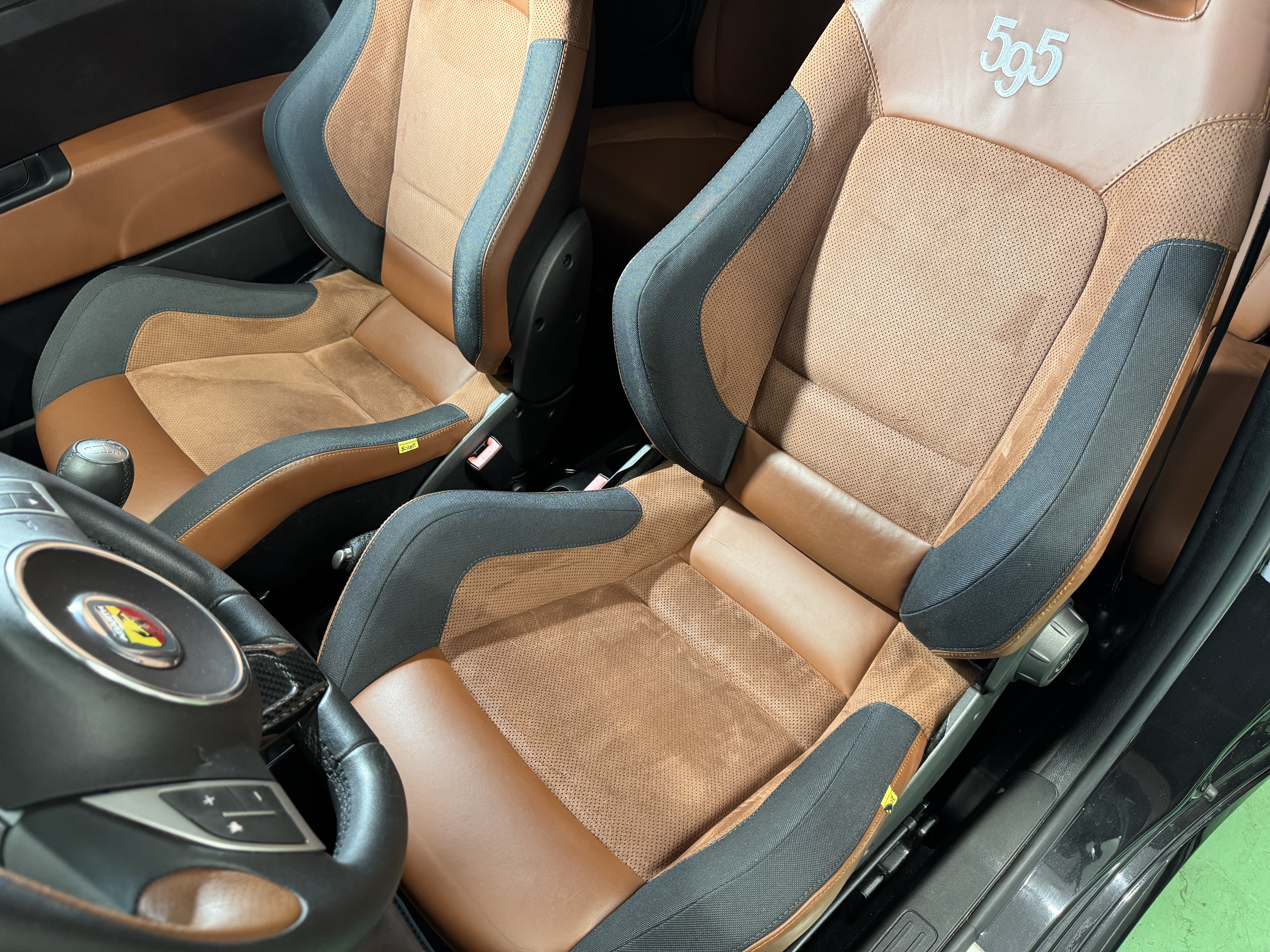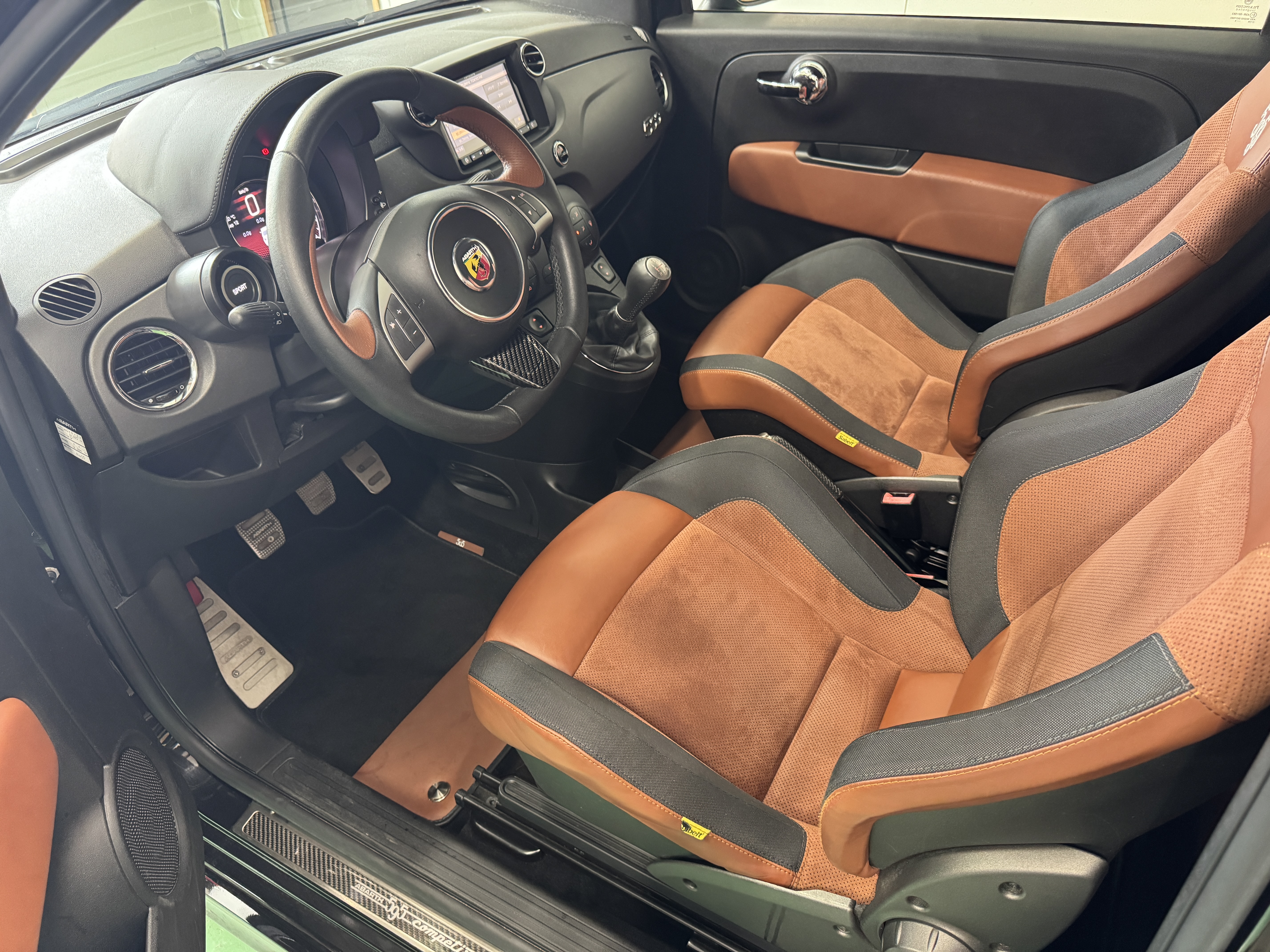 こちらのお車は595の中でも、走りを重視した「Competizione(コンペティツィオーネ)」ですので、最高出力180psでレコードモンツァデュアルモードエキゾーストシステム、専用17インチアロイホイール、サベルト製レッドアルカンターラ/ブラックレザーコンビセミバケットスポーツシート等を装備。
