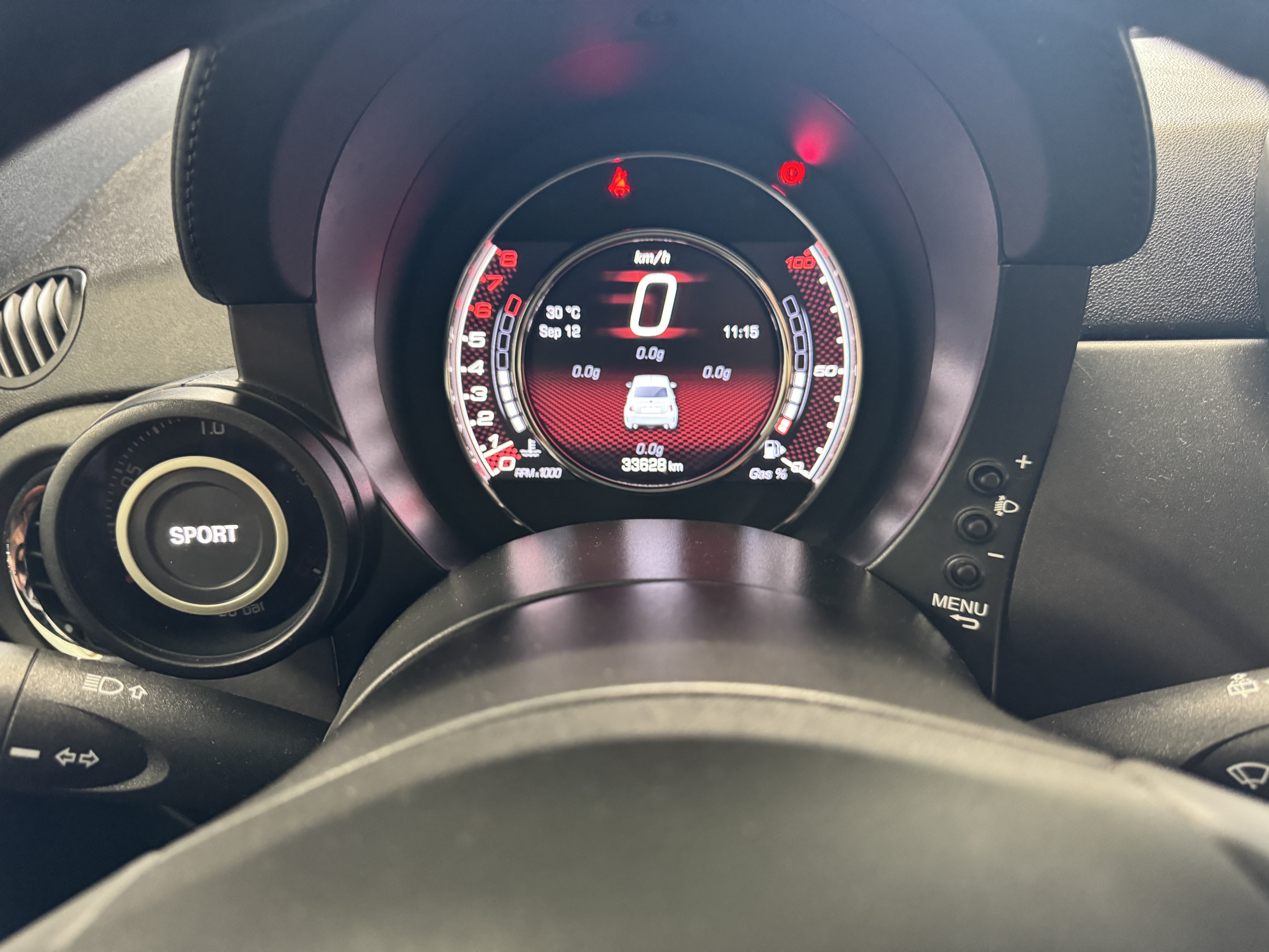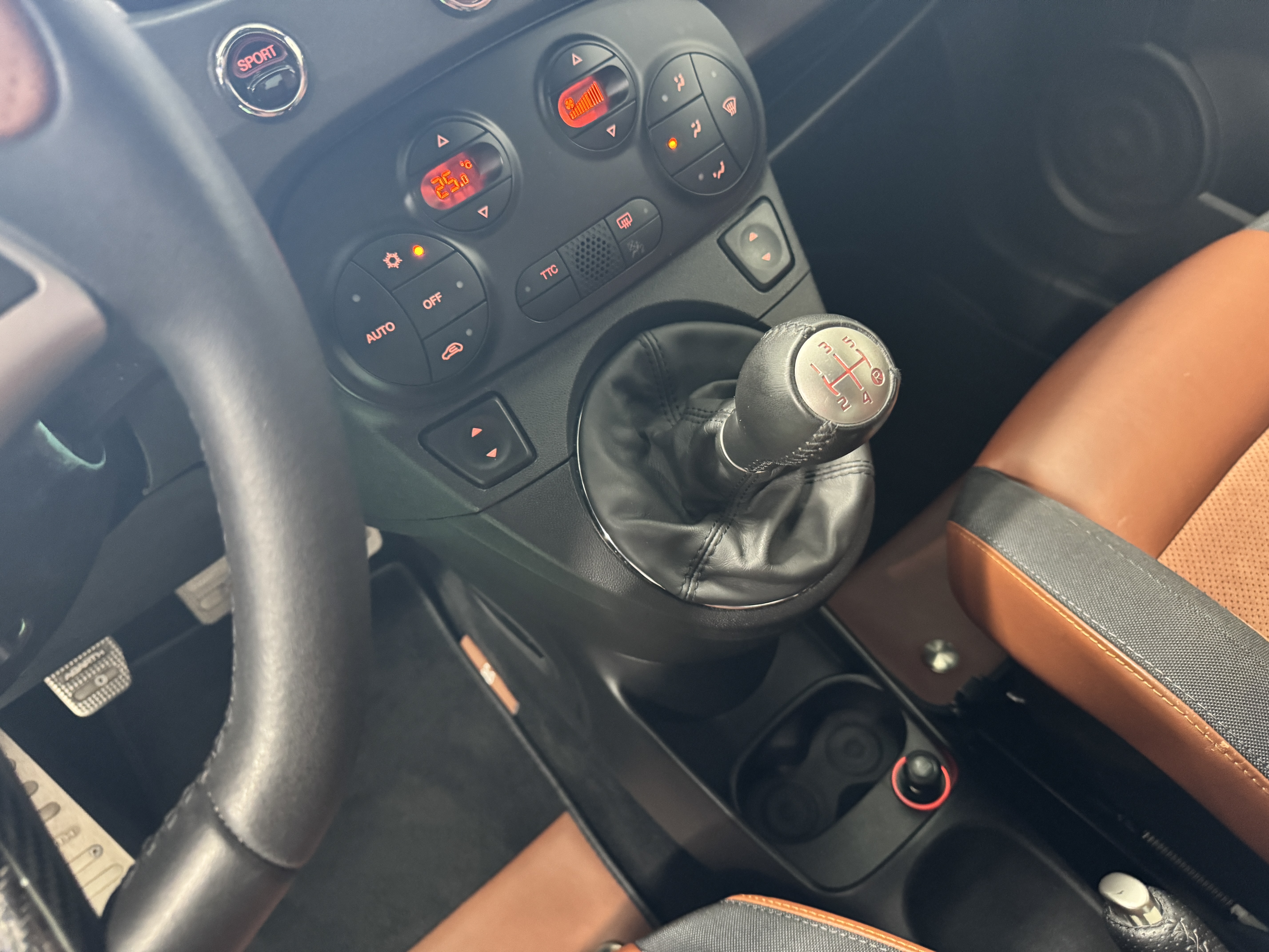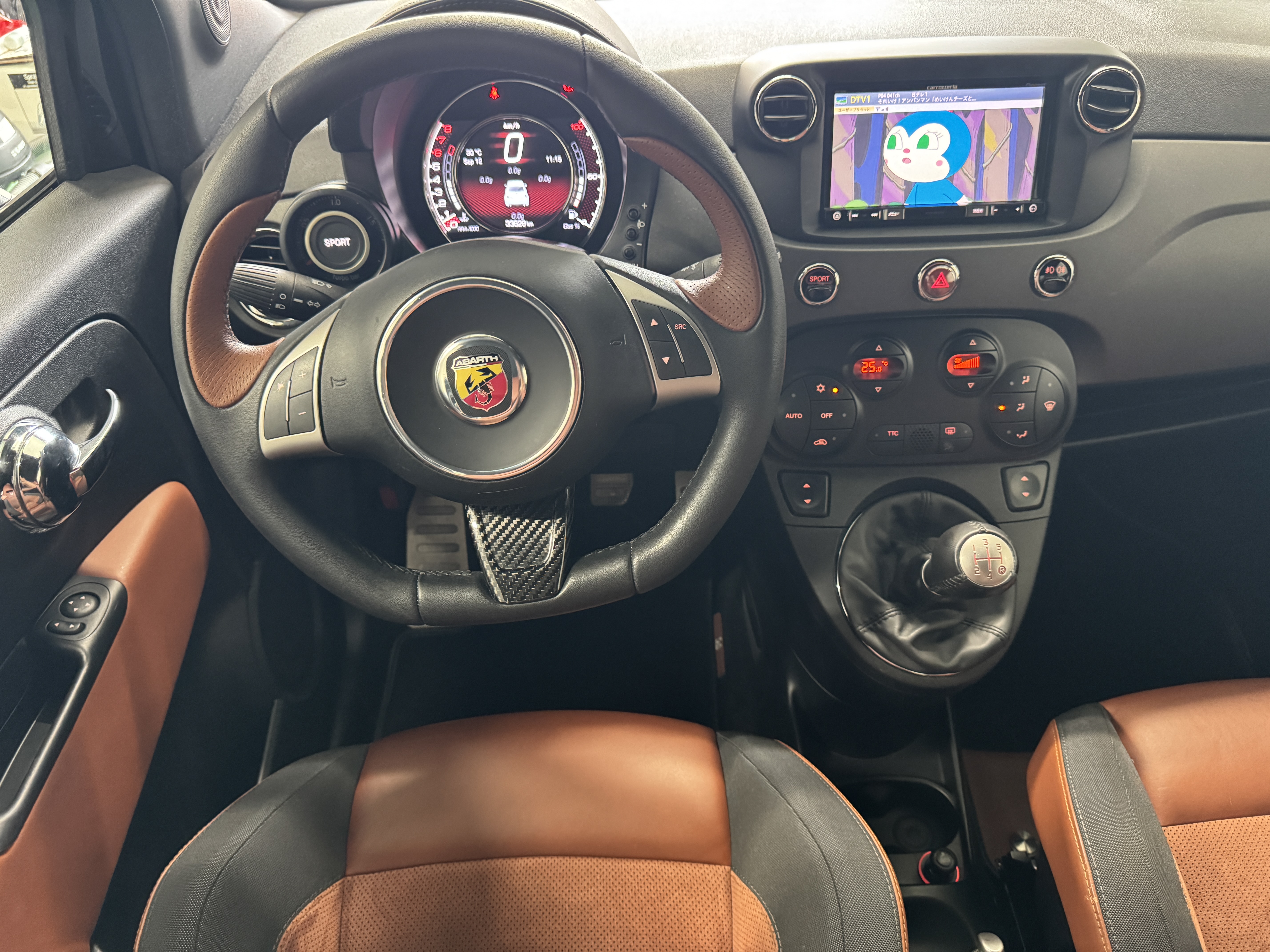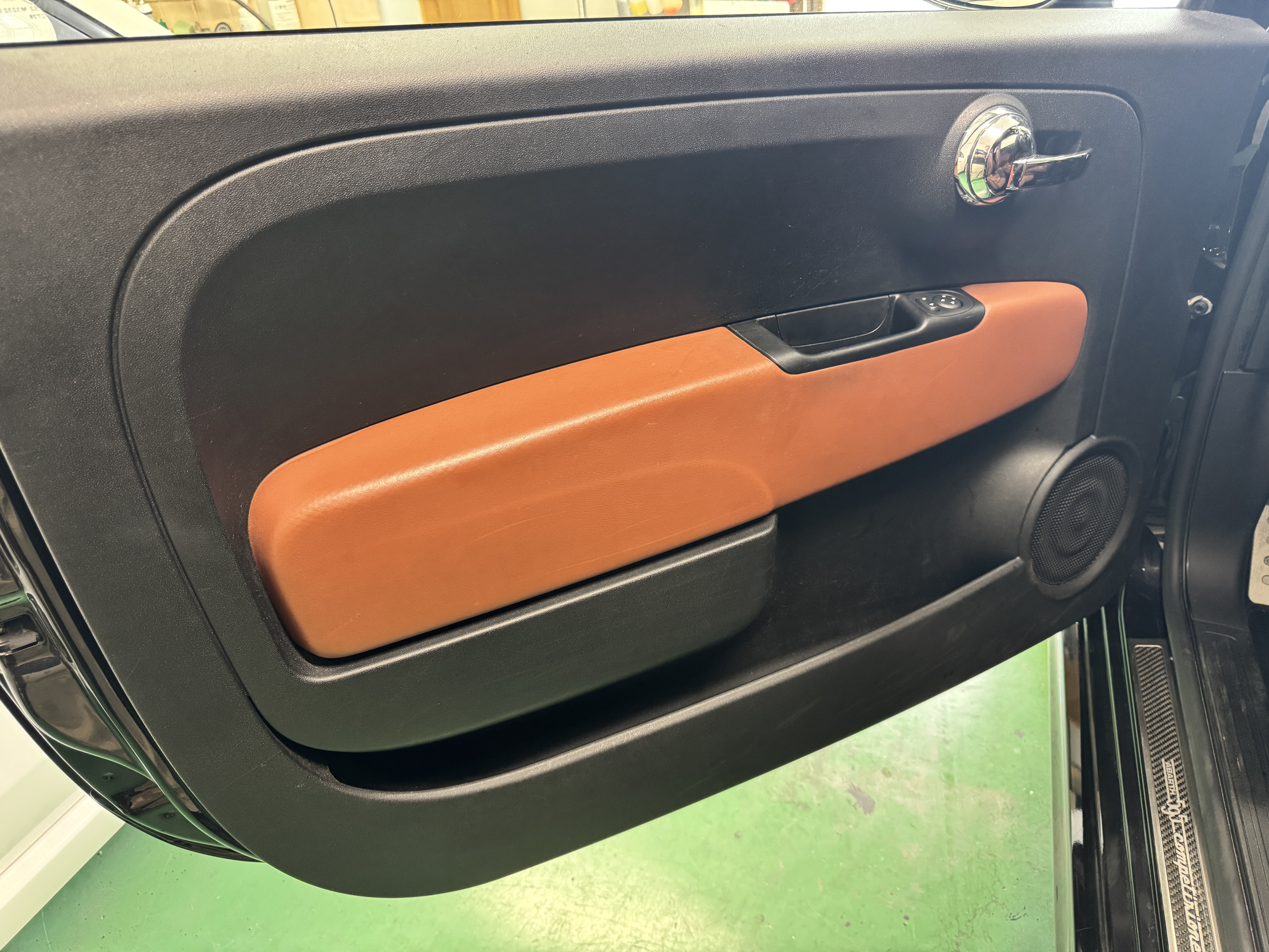 こちらのお車は595の中でも、走りを重視した「Competizione(コンペティツィオーネ)」ですので、最高出力180psでレコードモンツァデュアルモードエキゾーストシステム、専用17インチアロイホイール、サベルト製レッドアルカンターラ/ブラックレザーコンビセミバケットスポーツシート等を装備。